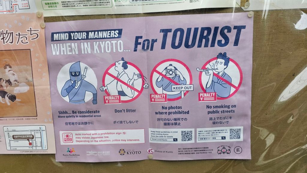 La vie quotidienne au Japon semble baignée de petits rituels où la recherche de relations apaisées semble dominer. Partout, le principe qui paraît reigner est de ne pas gêner son entourage, ne pas forcer le contact. Fumer dans l’espace public est interdit (des espaces sont réservés à cet effet). Les vélos sont simplement posés devant les maisons et les immeubles parfois sans avoir été cadenassés. Parler fort et s’étaler est proscrit et se repère de suite tant ce comportement n’existe pas. Pourtant, aucun regard désapprobateur n’est à craindre (mais on peut supposer que les autochtones n’en pensent pas moins …). Seuls les touristes détonnent parfois.
